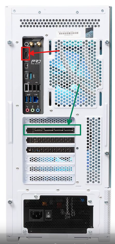 If there is a video card in your system the motherboard video ports won’t work by default. You will need to use the video card instead. If you cannot find the ports you are looking for on your video card, they may be covered/capped, which is very common in a new computer/video card. In the example below, the DisplayPorts on the right are covered: