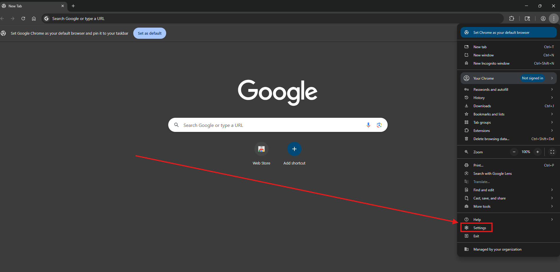 1. With Google Chrome open, click the three dots at the top right of the Chrome window. Click on Settings on the drop-down menu.