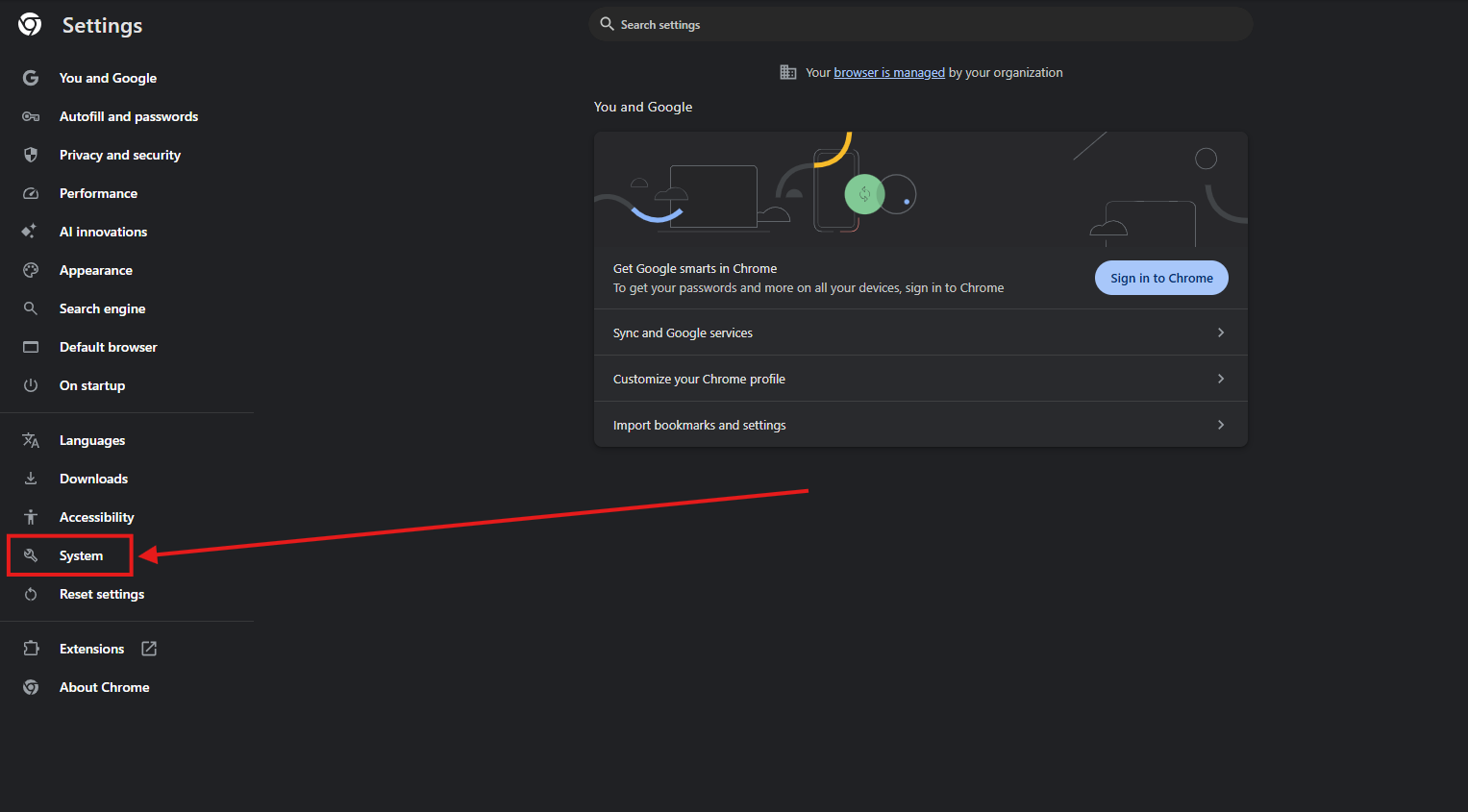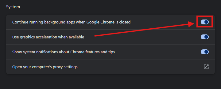 3. Under System settings, click the slider next to “Continue running background apps when Google Chrome is closed”, to turn the setting Off.