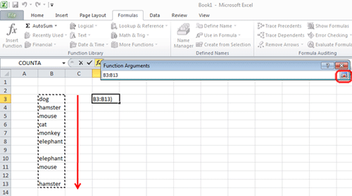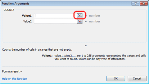 6. Click at the top of the range to be counted. Hold down the mouse button and drag to the bottom of the range. Release the mouse button and press the square in the Function Arguments box.