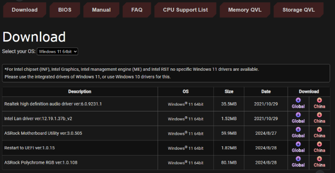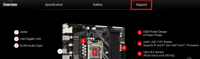 After clicking support you may see additional options such as Drivers or Downloads, as well as Manuals if you may want to see documentation on the board. For this ASRock board, we have a downloads option.