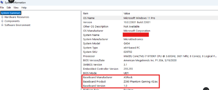 The system summery that opens up will show a lot of information about your computer, however, most of the important drivers we may need for troubleshooting will be for the motherboard. Locate Baseboard Manufacture and Product in the summary and make a note of the information. Note: these steps are for the motherboard, but if your looking for the video drivers, you may check Components > Display to see what card is listed.