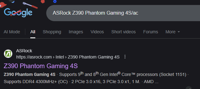 My computer shows we have the G434, and the motherboard is an ASRock Z390 Phantom Gaming 4S/ac so with this information in hand, we can now going to the manufactures website by searching Google or your favorite search engine by entering the full manufacture and model of the board. Once you find the listing you may click on it.