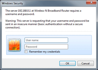 2. This will open the Tenda login screen. Type the username and password associated with the router and press OK. The default username and password are both admin if you have not changed them.