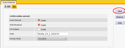 6. Once the Enable box is checked, more options will appear. One of these options is SSID Broadcast, which will allow the network to be seen when a computer scans for available networks. Another is AP Isolation, which will prevent computers connected to the guest network from seeing each other. This will prevent any unwanted computer access from other users on the network. Finally, there are the SSID and the Security Mode. The SSID is the name of the network, which can be set to anything, and the security mode will determine what protocol is used for security of the network. If a password is desired, WPA-PSK, WPA2-PSK, or Mixed WPA/WPA2-PSK should be used. If a password is not desired, the security mode may be set to either Disabled or Open. Shared is not recommended unless older devices that do not support WPA are being used, as it can be less secure than the WPA standards. Once the settings have been decided upon, click on the Save button in the upper right.