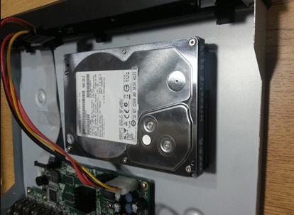 3. Turn the unit on its side while holding the hard drive in place - take the screws that came in the DVR's packaging and screw the hard drive in place.
