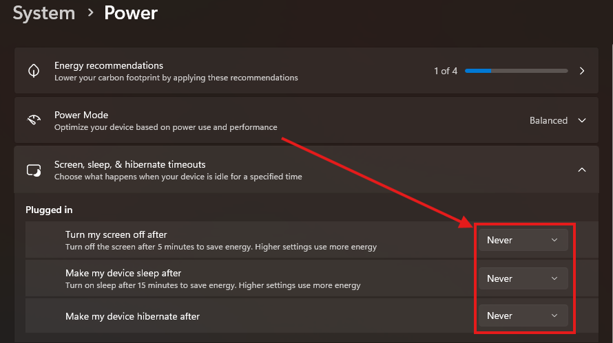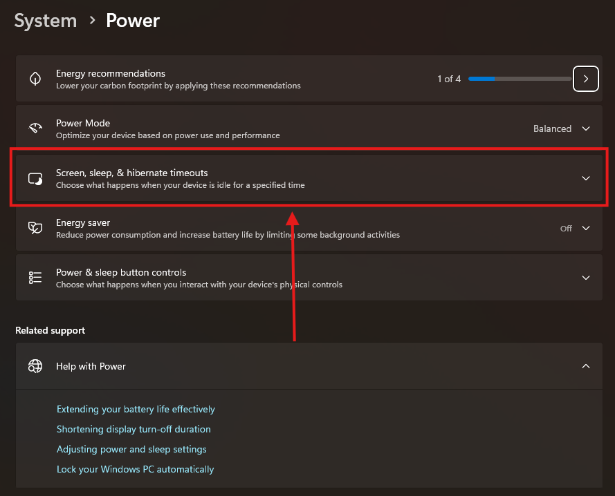 2. On the “Power" menu, under Screen and Sleep, there is a drop-down menu with time options.