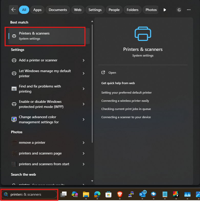- Search Printers in the Windows search bar, typically found at the lower left corner of the screen or the bottom middle, then click on the Printers and scanners system settings.
