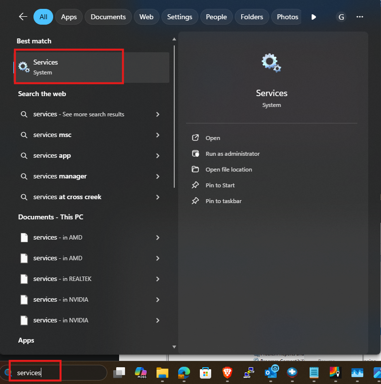 - Search Services in the Windows Search Bar, typically found at the bottom of the screen on the taskbar, then click on the Services app result.