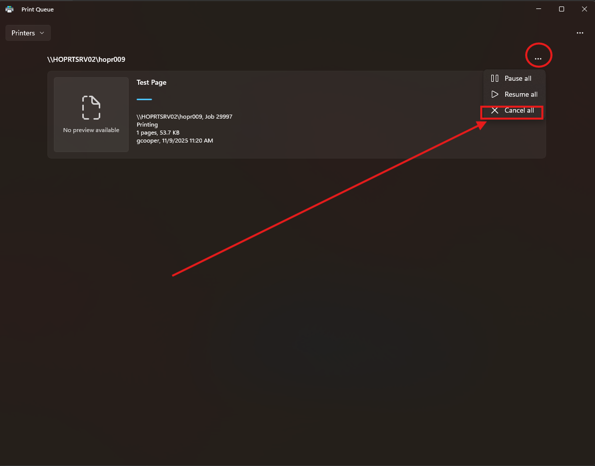 - It will take you to this page, and it will show you all the documents that are printer queue. All you need to do is click on the three dots at the top right and select Cancel all.