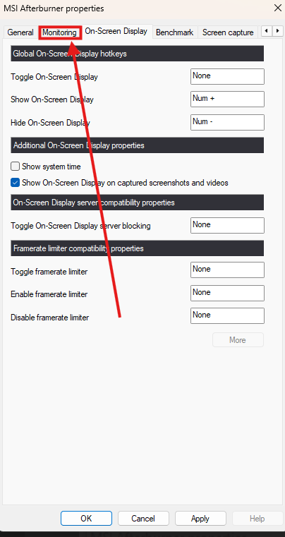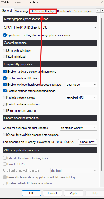 Step 7: Navigate to the tab labeled "On-Screen Display". This page will allow us to set a hotkey to show/hide the on-screen display so that it's not always in your way while gaming, and will allow you to turn it on when needed.