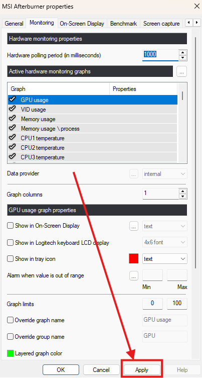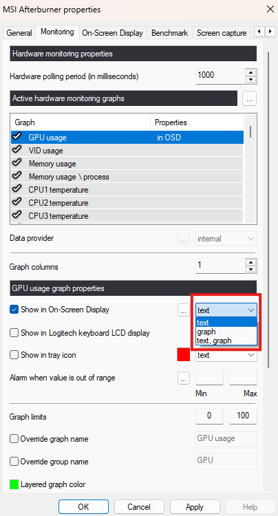 Extra tips: If you'd prefer seeing graphs over text, you can select the drop down next to "Show in On-Screen Display" to enable a graph, this will still be in the monitoring tab. This is extremely helpful when monitoring Framerate and Frametime data, as it will help illustrate when your performance dips.