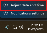 1. Right-click on the Time and date, typically found in the bottom right hand corner of the screen.