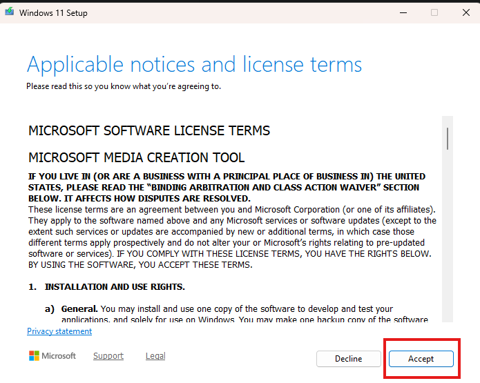 14. Click Accept to agree to the notices and license terms.