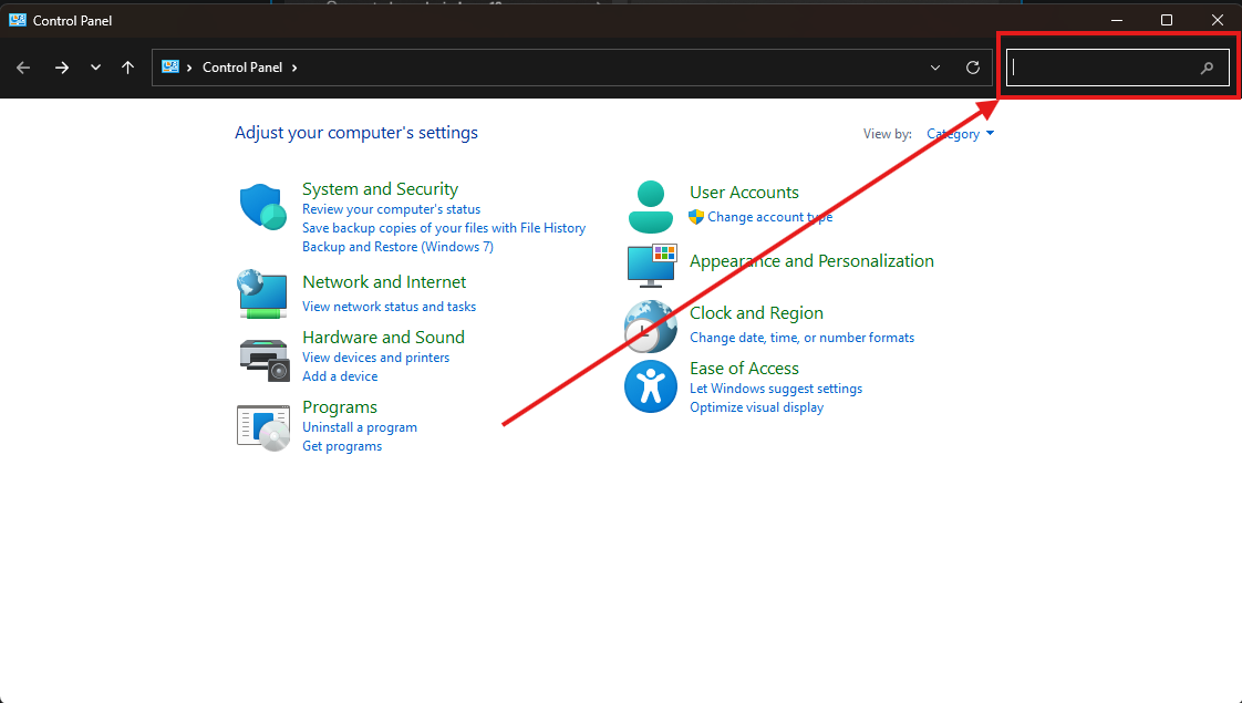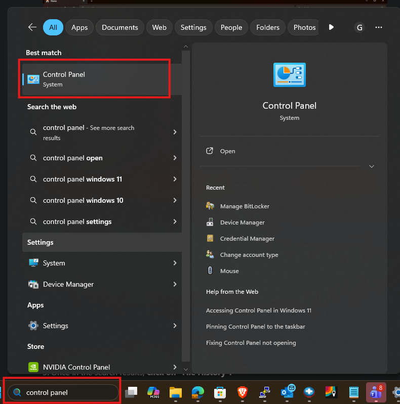 1. Click on the Start button, or on the Search on the Taskbar, and type in “Control Panel” then open it.