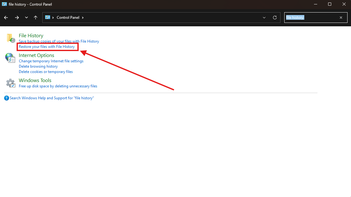 1. To restore data, go to the Control Panel again and type in “file history”, then select “Restore your files with File History”