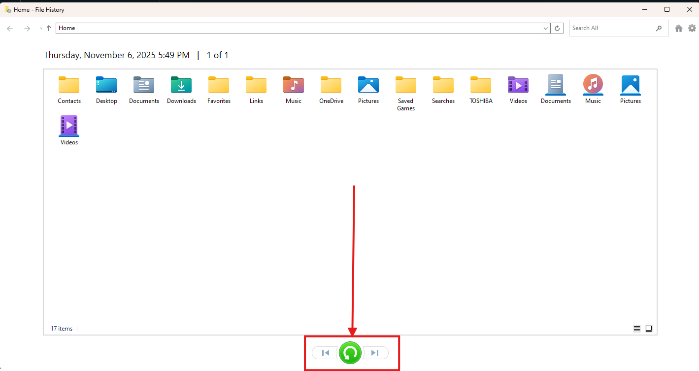 2. Select the date you want to restore from using the arrow buttons at the bottom and then click the green button, it will restore all files from the backup you selected.