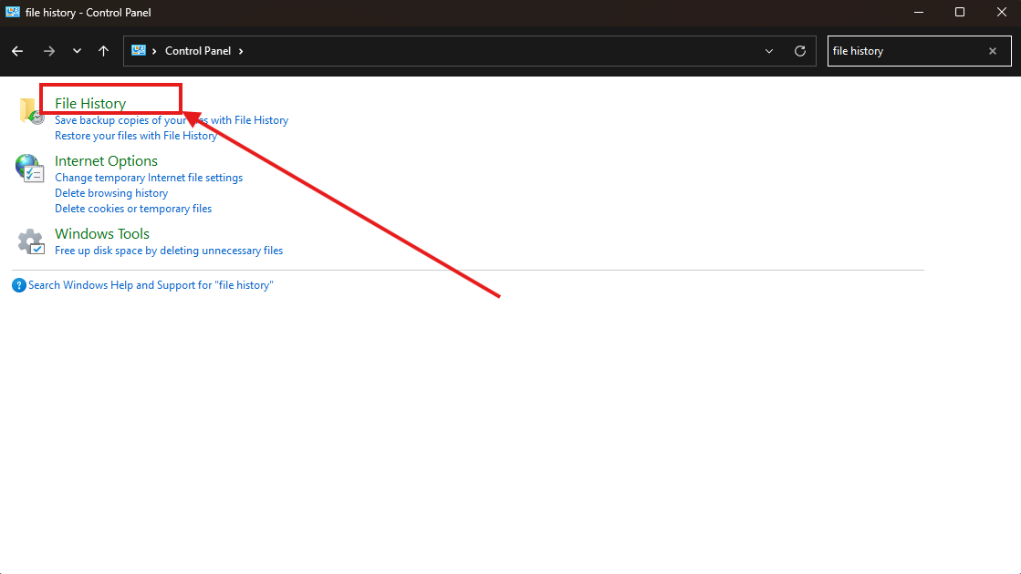 2. In the Search box for Control Panel, type in “File History” then press the enter key.