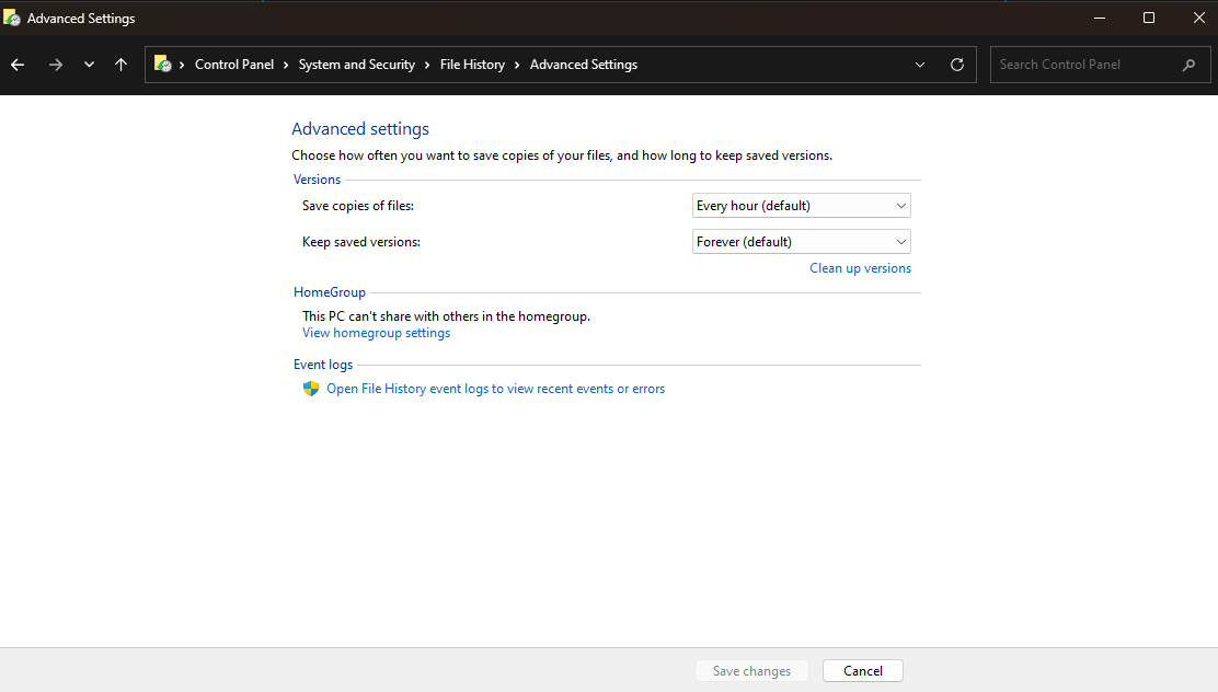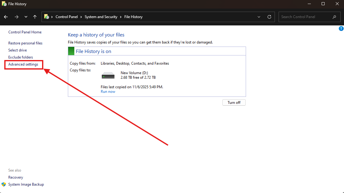 6. To change the frequency file history saves and deletes your files, you can go to the main page here and click on Advanced settings.