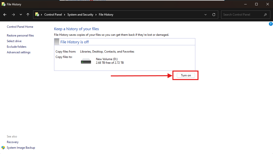 4. Plug in a drive if you have not already (for this example we are using a Hard drive, but you can use any type of external or internal hard drive for this(as long as its not your C drive)) you would like to back up your files to and then click on “Turn on”
