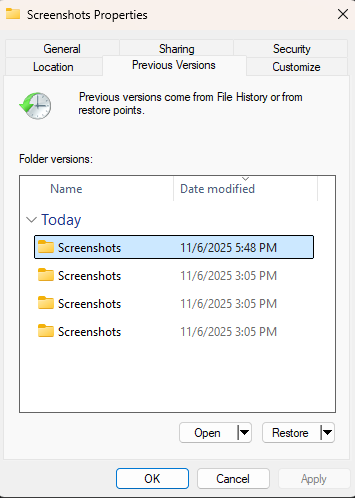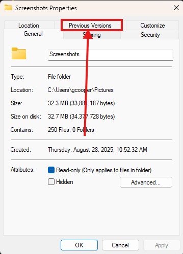 5. Then it will pull this page up, you will need to select “Previous Versions” and it will pull up a list of backups of that folder along with the date and time it was backed up. You will need to select the version you would like to go back to and then hit restore.