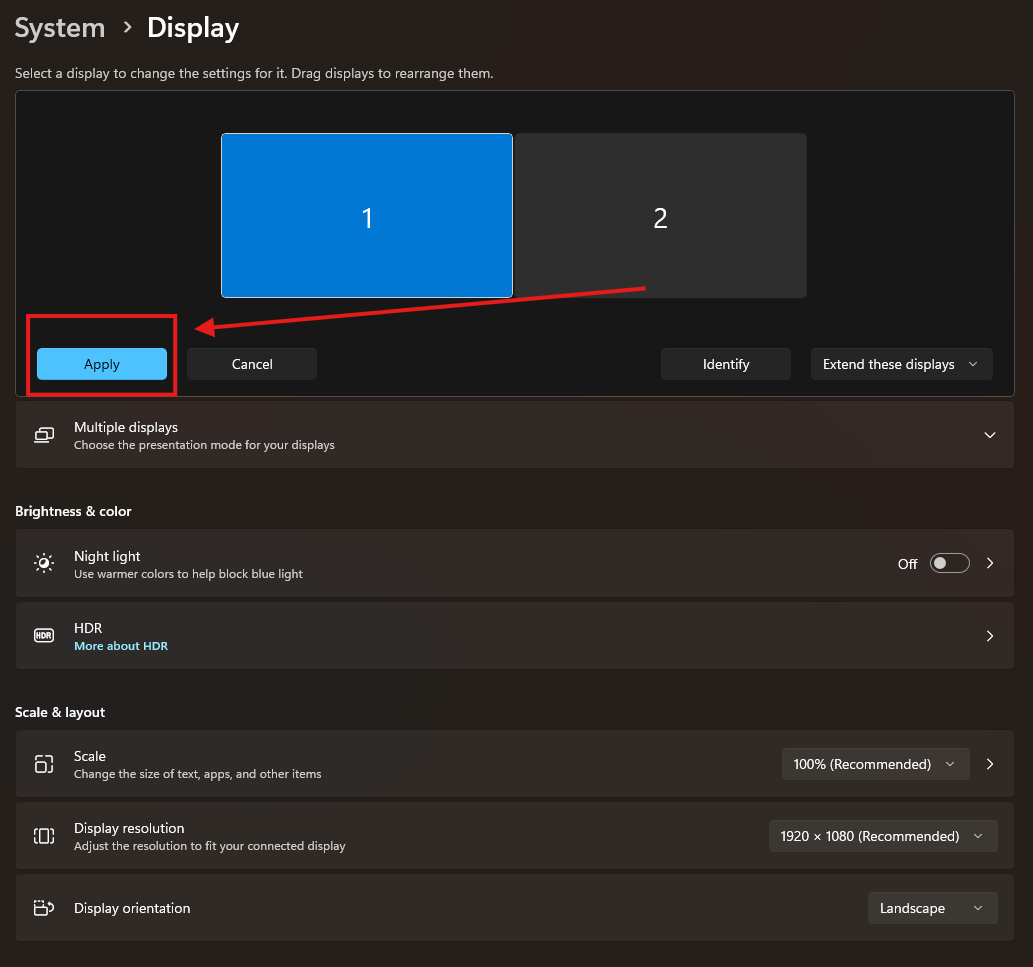Then, click on Apply when they are in the proper position. In my example, my monitor that has the number 1 is on the left, but your system may vary from our example settings.