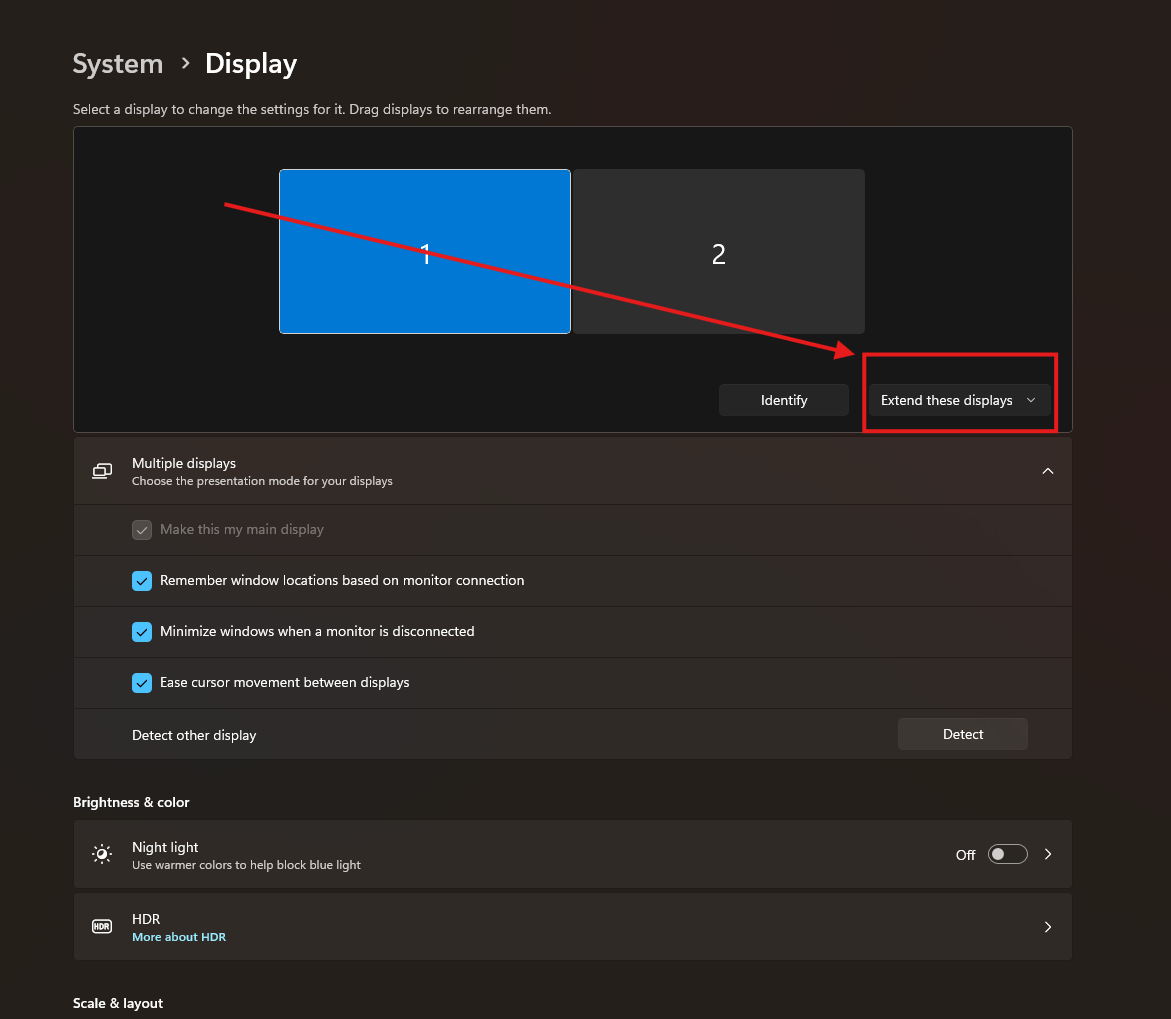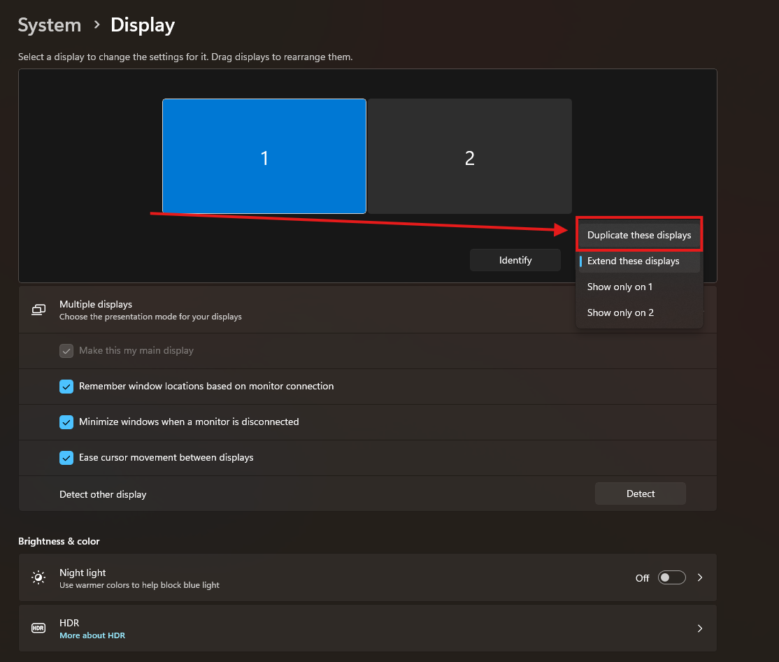 In case your want your monitors to mirror each other and not act as one combined workplace/separate displays, you will want to select this box underneath and change it to “Duplicate these displays”.