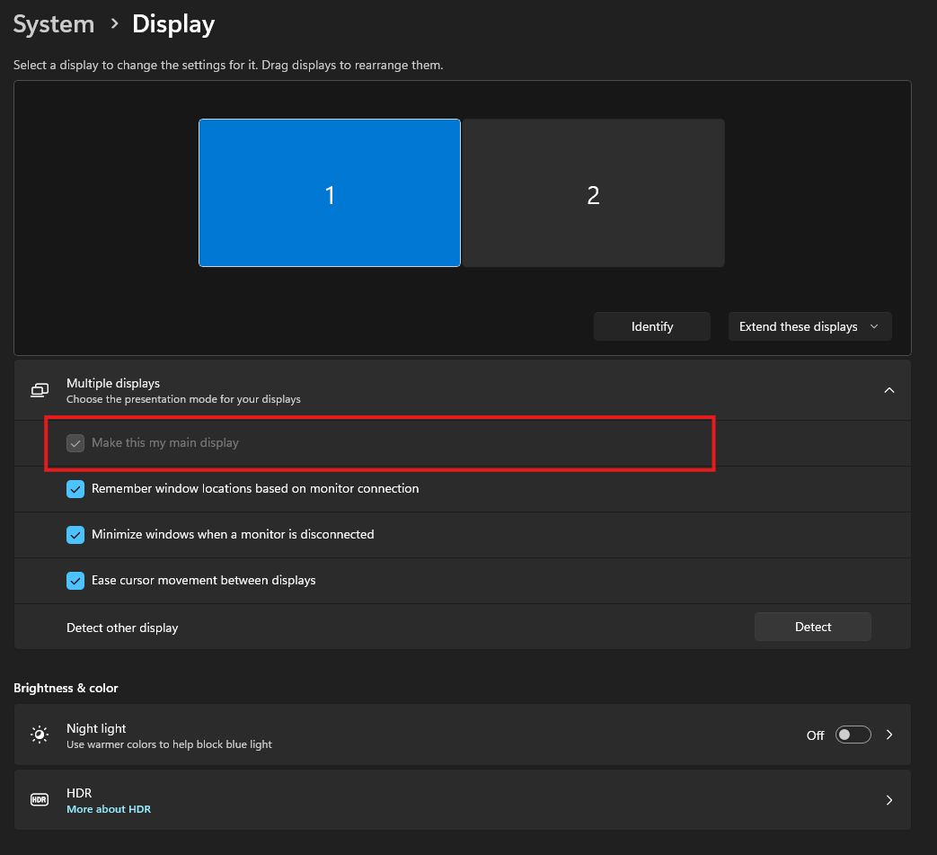 5. One of your multiple monitors will be the “Main Display” where programs will open by default and where most of your programs' shortcuts will be placed. Select the monitor you want as your main, it should highlighted (in my case it is purple but it depends on what color you have set as your accent color) then select “Make this my main display