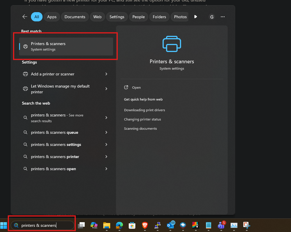 1. Click on the Windows icon, typically found at the bottom of the screen, type in “Printers and Scanners”, and click on the option for Open.