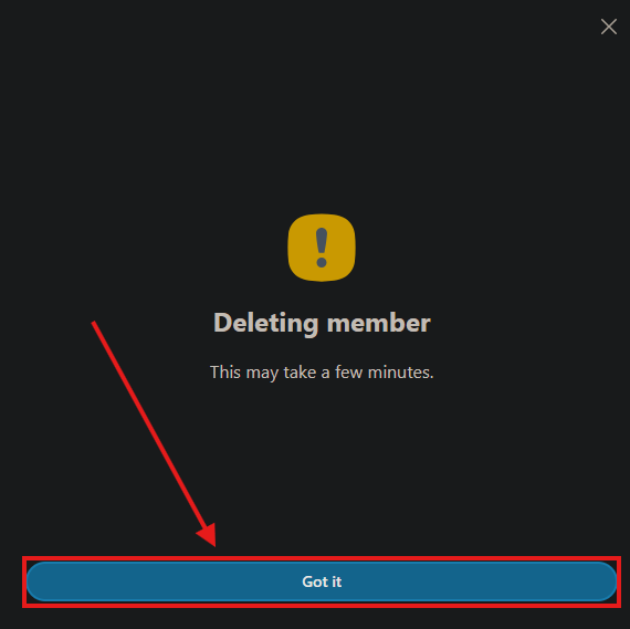 7. One more box will pop up confirming the deletion of the member, it may take a few minuets to complete, click Got it: