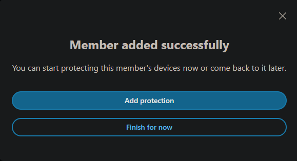 5. A box will pop up saying "Member added successfully". If you have an ESET License you want to attach to them, click Add protection and then continue to step 5. of the Attaching a license section. Otherwise, click Finish for now: