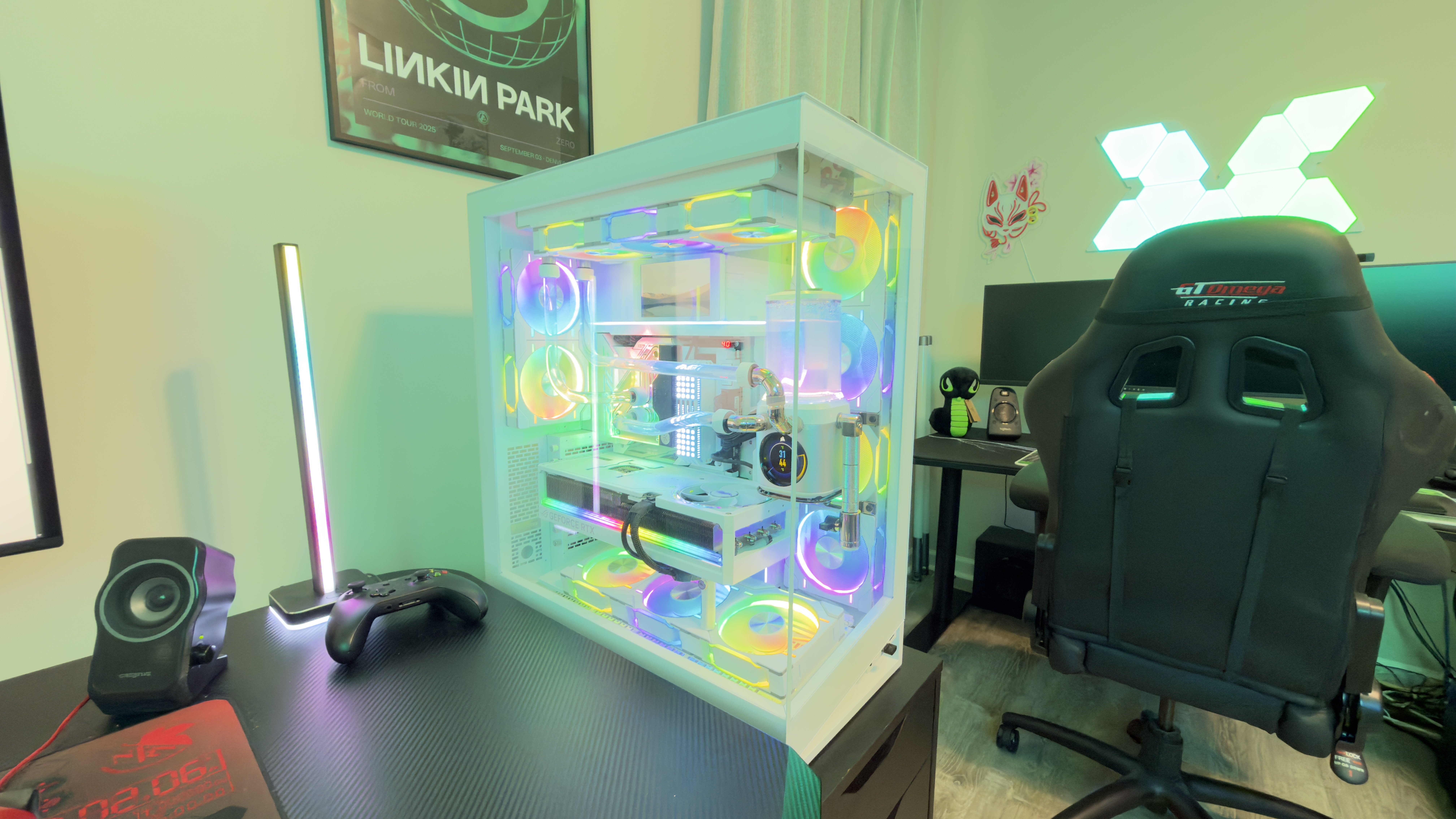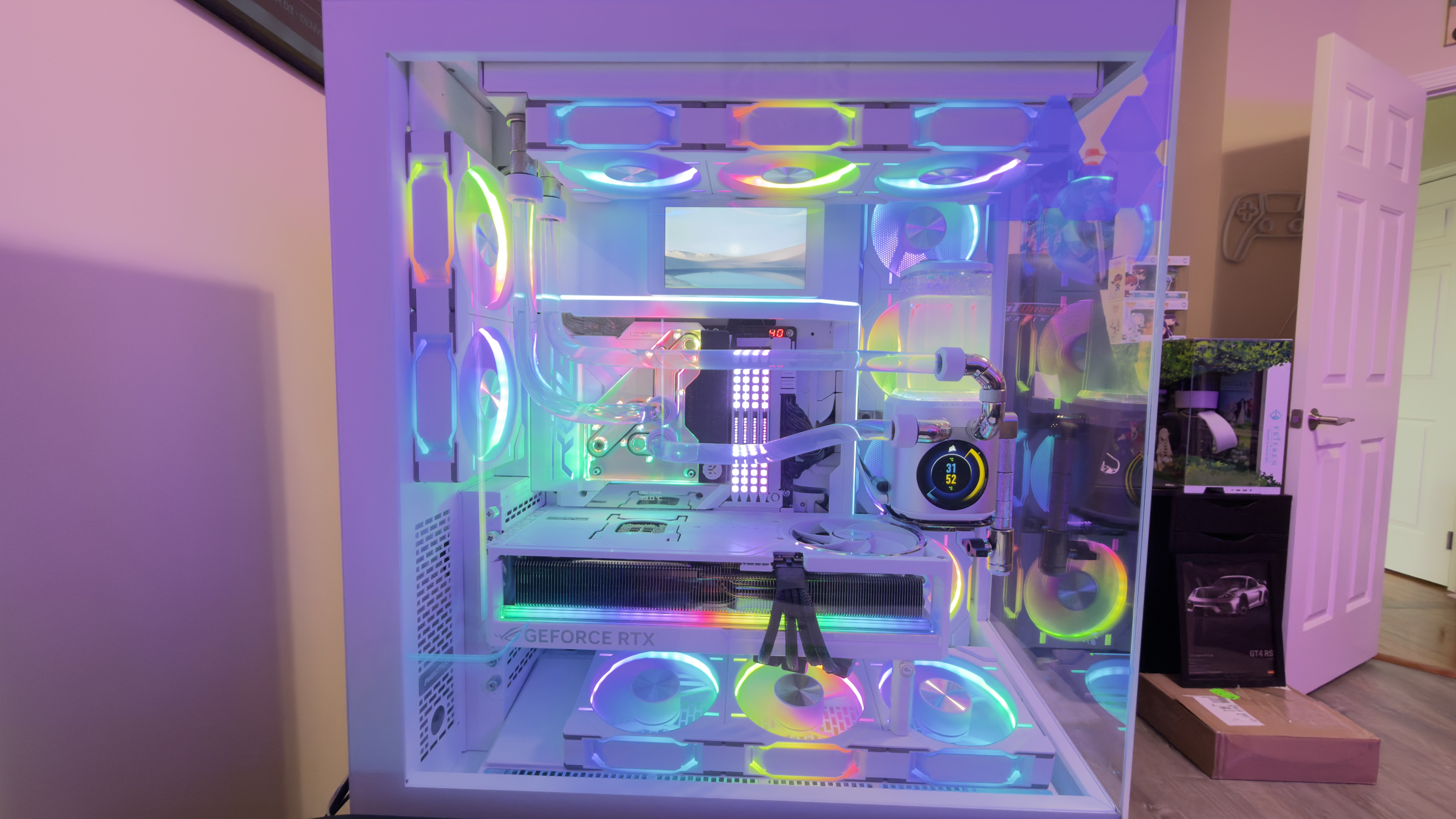This is my current build. This is a Phanteks NV7 case in Matte White. It has 12 Phanteks RGB fans with 7 intake and 5 exhaust. Inside are the following components: ASUS ROG Maximus Z790 Formula (White) / Intel 13900K / ASUS ROG ASTRAL 5090 OC (White) / EVGA 1300W PSU / 4X 16GB DDR5 5600 Dominator Memory (White) / 2 - Samsung 990 4TB NVME SSD's / 2 - Samsung 990 2TB NVME SSD's / Corsair 5.5" 1440P Screen / Custom water cooling loop W/ 1-360x60 radiator, Corsair HX D5 pump, two piece EK CPU/VRM water blocks. Additional Light package by Phanteks for trimming the glass is on order.